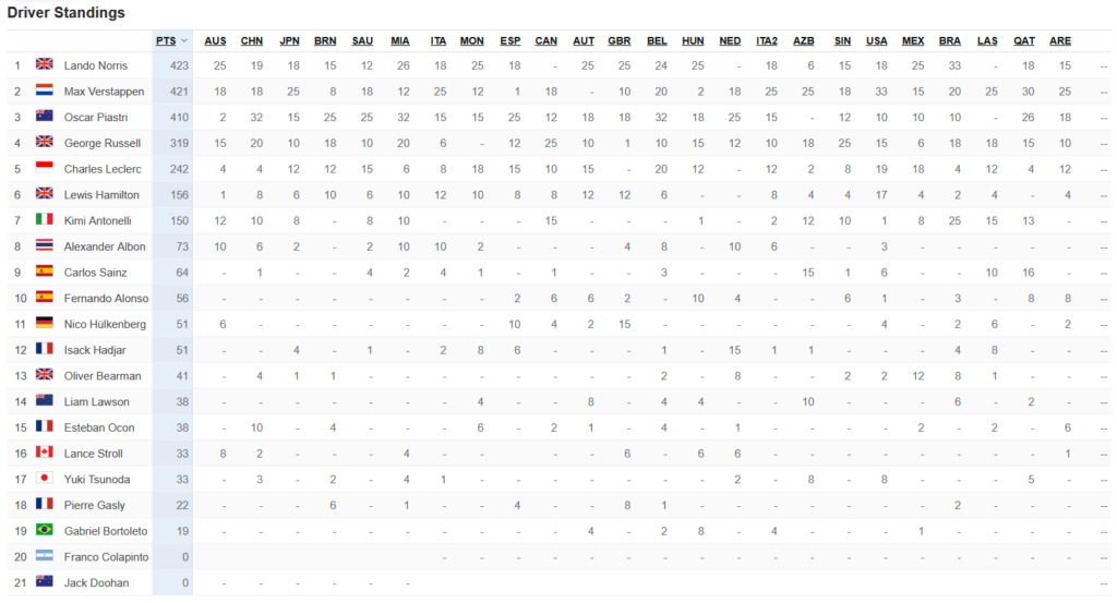 Im letzten Rennen entschied Norris in dem er ein Podium einfuhr die Fahrerweltmeisterschaft für sich. Die restlichen Ergebnisse sehen Sie hier: