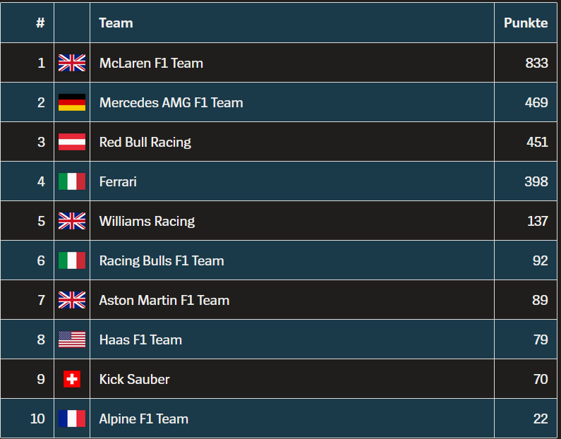 Sie wollen mehr über die einzelnen Fahrer herausfinden klicken Sie hier:McLaren dominierte die Saison wodurch sie die Fahrerweltmeisterschaft schon nach dem Rennen in Singapur vorentschieden gewonnen haben. Nach Abu Dhabi sehen die Ergebnisse so aus: